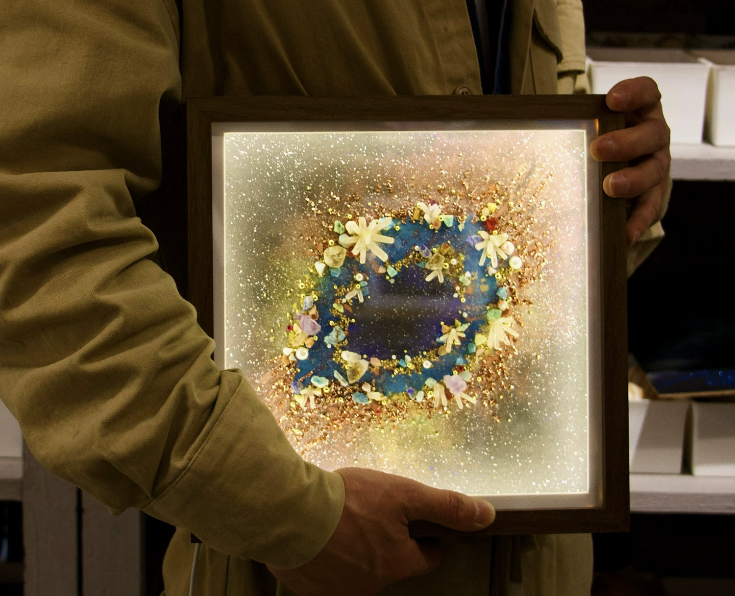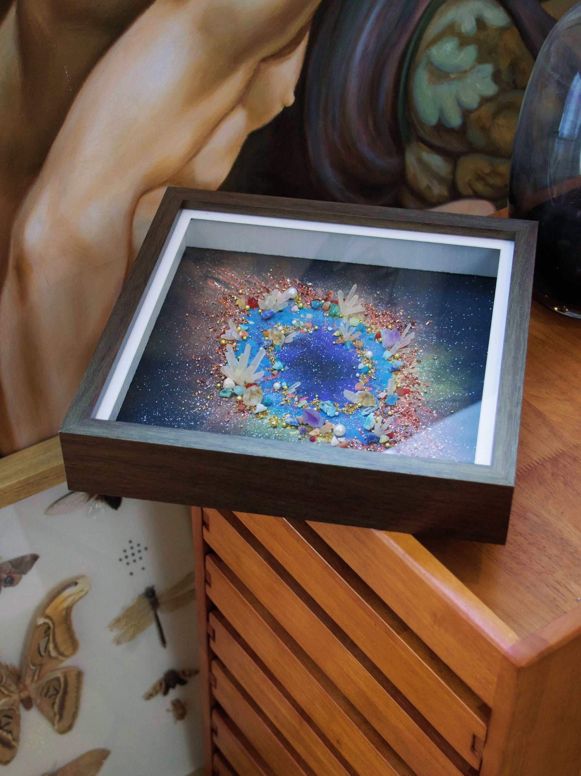 Encased within this painted observatory, time slows to the rhythm of orbiting light. Each crystal ore, carefully set into the frame, becomes a celestial anchor—a fragment of a distant sun or a silent meteor’s legacy. The artwork does not merely depict the cosmos; it harnesses its tangible whispers.